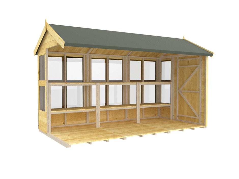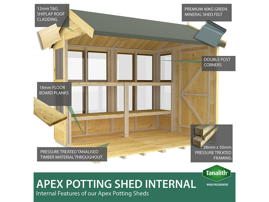 Our potting sheds are built to withstand the heavier elements of British weather, with tongue and groove cladded panels, which are pre-engineered to be as weather resistant as possible. No matter plants and prized possessions you store in our potting sheds, you can be sure it will be protected. With a variety of window placement options, you can make maximum use of the natural source of light. With a FREE internal shelf this will allow you to position your plants in the prime location to help them grow.?The pressure treated tongue and groove construction is a much more substantial design than your normal overlap cladding, utilising thicker material for an overall stronger structure. With its heavy-duty floor, you have also the peace of mind that you won’t be restricted to storing the heavier of goods within. These potting sheds are the ultimate plant storage building which will suit all your needs.