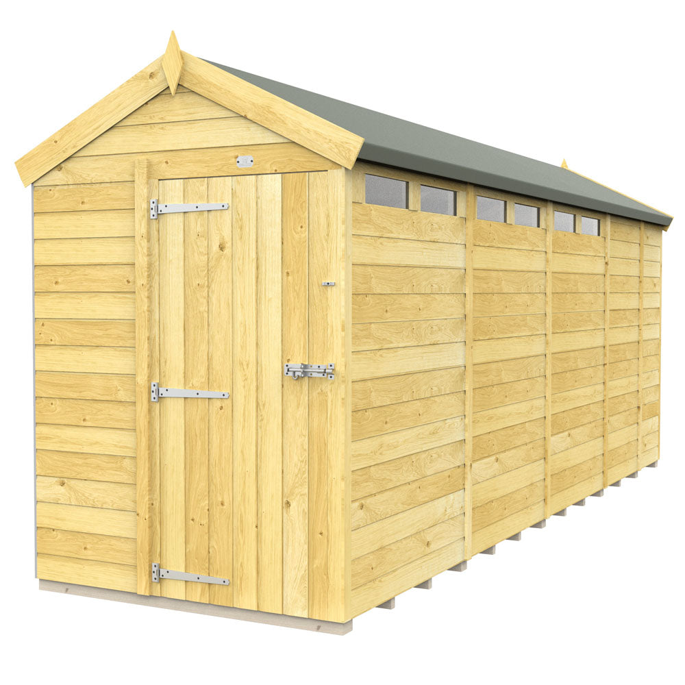 Our 5ft x 17ft Apex Security Sheds are built to withstand the heavier elements of British weather, tongue and groove cladded panels which are pre-engineered to be as weather resistant as possible. No matter whatever you store inside of the wooden garden sheds, you can be sure it will be protected. With a variety of window placement options, you are able to make maximum use of the natural source of light.