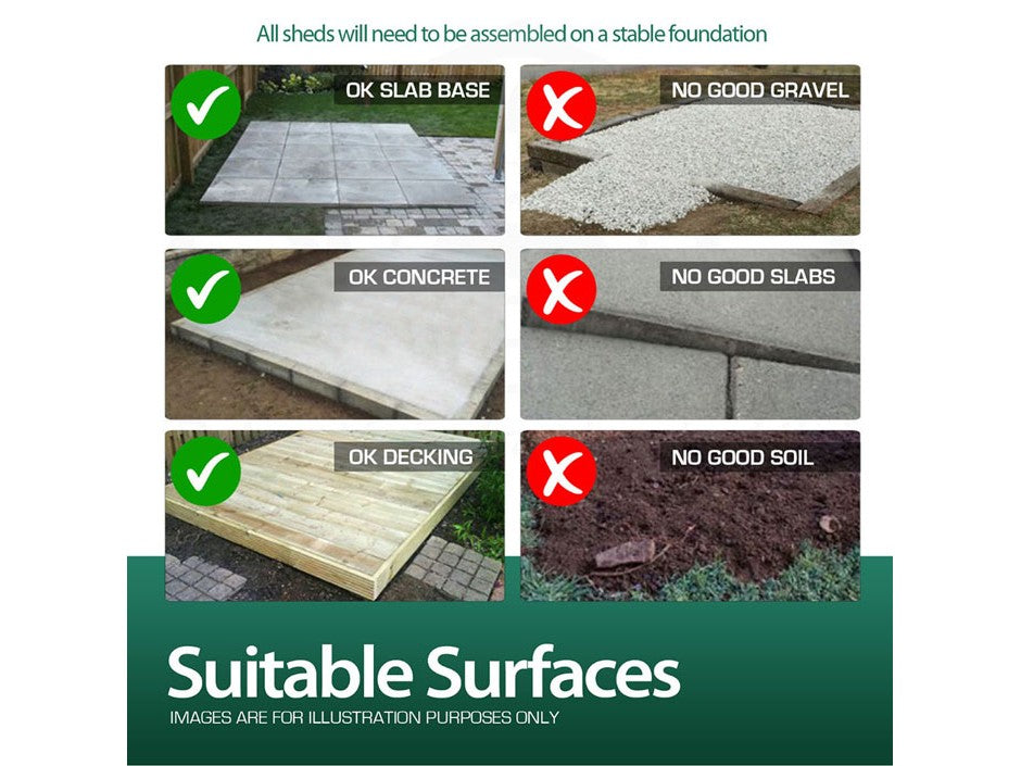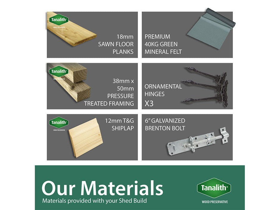 • 18mm pressure treated floorboard planks consisting of floor bearers attached underneath to elevate off the ground