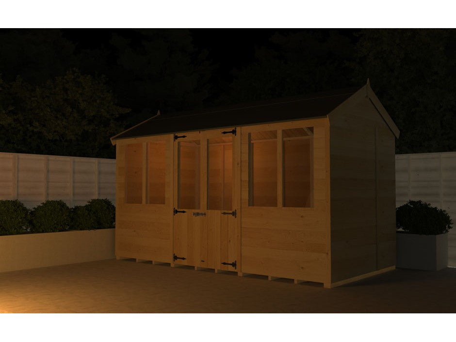 Large toughen glass gives an added safety feature as well as maximizing use of natural light. The pressure treated tongue and groove construction is a much more substantial design than your normal overlap cladding, utilising thicker material for an overall stronger structure. With a heavy-duty floor, you have also the peace of mind that you won’t be restricted to storing the heavier of goods within. These summer houses are the ultimate garden storage building which will suit all your needs.
