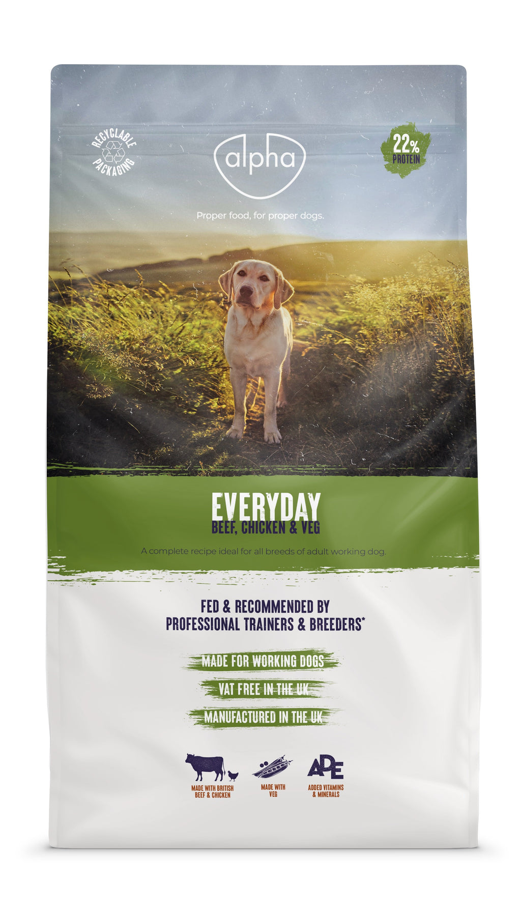 Alpha Everyday Adult Dog Beef, Chicken & Veg. Alpha Everyday contains beef, chicken & veg. It is a nutritionally complete and balanced food for all breeds of adult dog. Alpha Everyday recipe has been formulated with Alpha’s no-nonsense approach at it’s heart. By only including what your dog needs and nothing it doesn’t, we are able to offer this complete diet at incredible value.