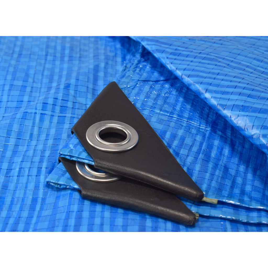 TARP50GBLUE4X8 Each tarpaulin comes equipped with 12mm aluminium eyelets every 0.5m along each edge of the tarpaulin, these are hemmed in and have corrosion and rust resistance. This size tarpaulin also has reinforced corners.