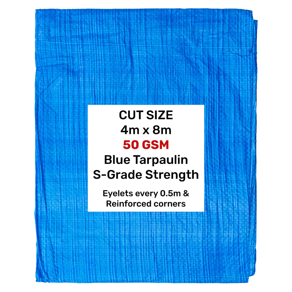 Our blue 50gsm tarps come in various sizes allowing users to choose the one that best fits their needs. This tarpaulin is 4 metres x 8 metres. Other sizes are available on separate listings.