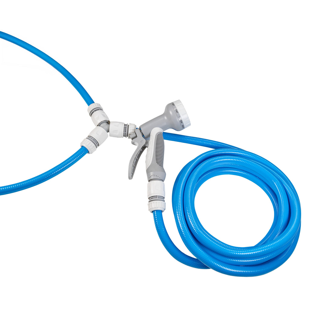 Introducing the ultimate Dog Shower Kit, designed to make bath time a breeze. This comprehensive kit includes a high-quality hose pipe, click-lock quick connectors, three-way splitter and a versatile multi-pattern spray gun, ensuring that you have everything you need for an efficient and enjoyable dog washing experience. The hose pipe is long enough to provide ample reach, while the quick connectors allow for easy attachment and detachment, making setup and storage simple. The three-way splitter allows you to connect to both hot and cold water taps, giving you full control over the water temperature to ensure a comfortable experience for your dog.