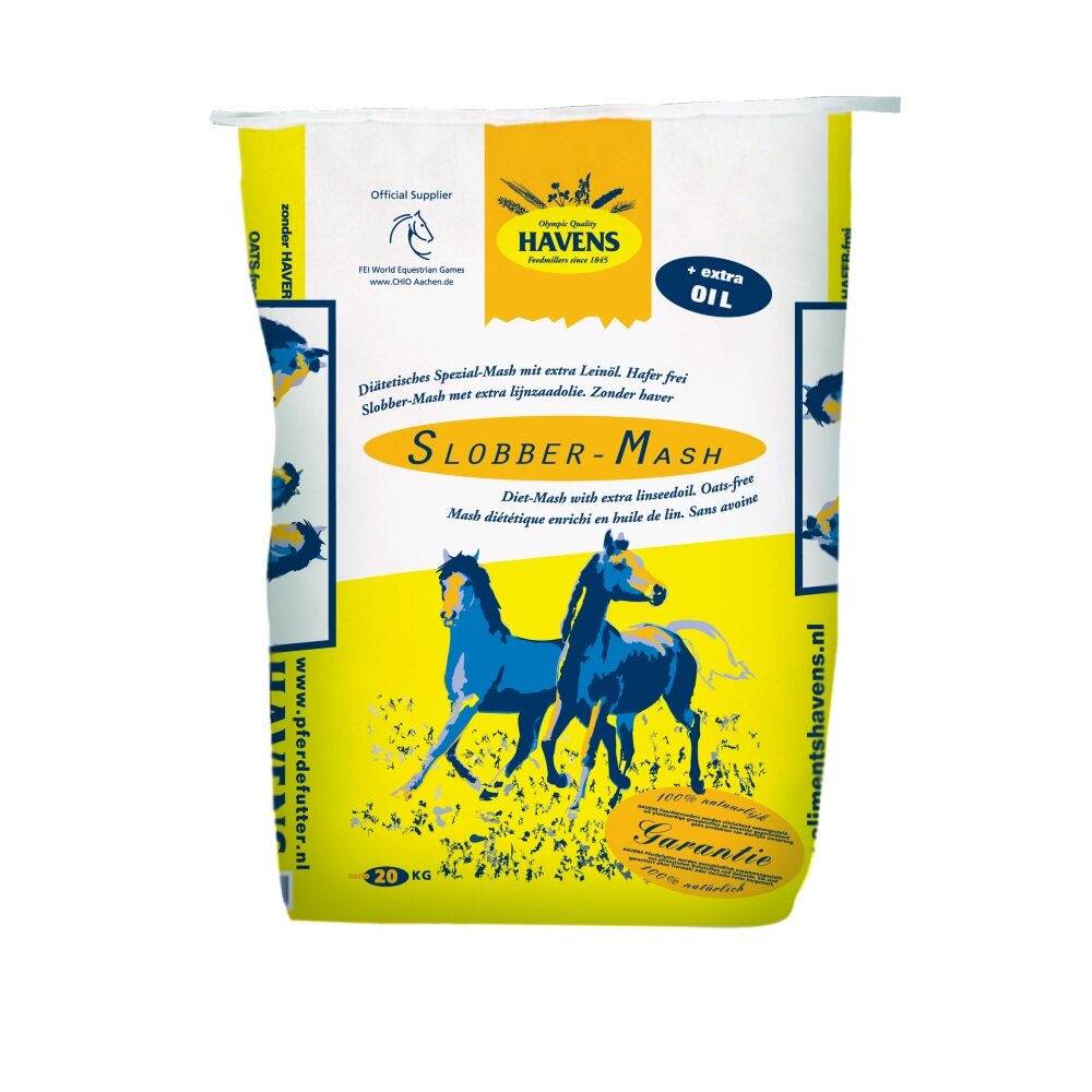 Havens Slobber-Mash is the original oats-free mash with toasted linseed meal for a purifying action and perfect appearance. The special formula stimulates the skin, hair and hooves and has a very positive effect on the intestinal flora. Due to the easy absorption Slobber-Mash is ideal for older horses with chewing problems.