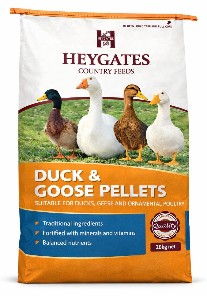 Heygates Duck & Goose Pellets are a high-quality general-purpose grower diet, designed to follow on from chick crumbs from 3–4 weeks of age. With 17% protein, they support steady growth and good overall condition in ducks, geese and ornamental poultry.