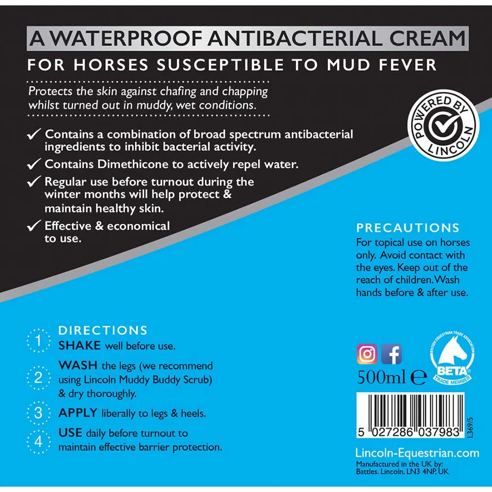 Lincoln Mud Screen is a specially formulated, water-resistant barrier cream designed to protect your horse’s legs from the damaging effects of wet, muddy conditions. Ideal for use during the autumn and winter months, this advanced formula helps guard against mud fever by creating a protective layer that repels moisture and dirt, while allowing the skin to breathe.