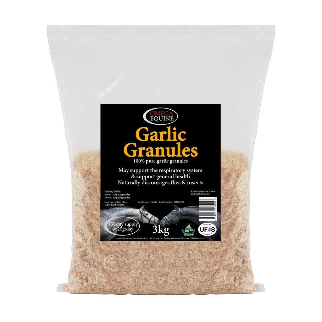 Omega Equine Garlic is a natural equine supplement designed to support overall horse health and wellbeing. Made from 100% pure garlic, it is available in both powder and granule form, making it easy to incorporate into your horse's daily feed. Garlic is well-known for its health-promoting properties, and this supplement delivers those benefits in a palatable and safe way for horses and ponies.