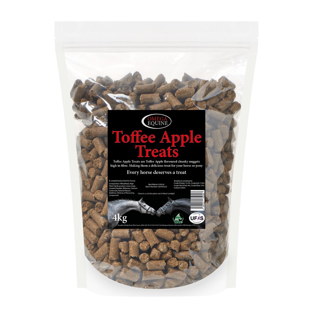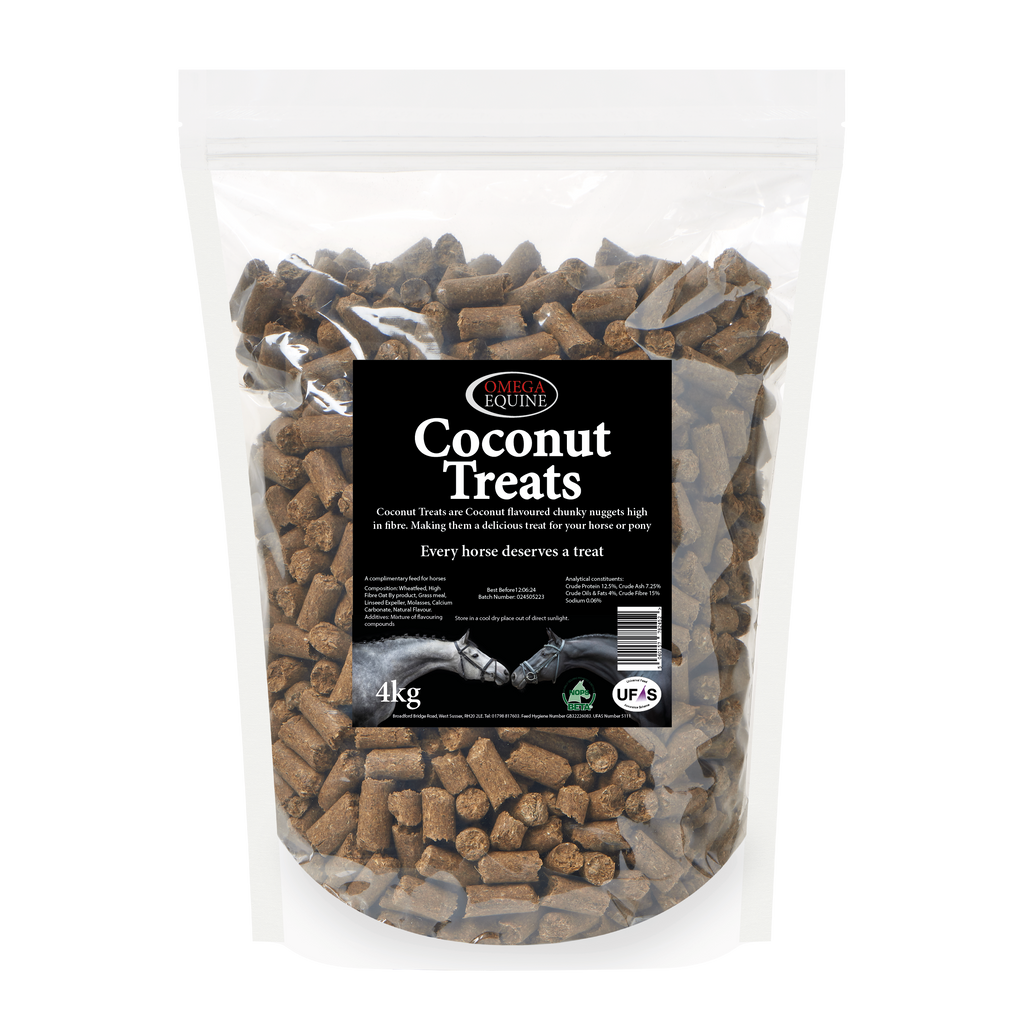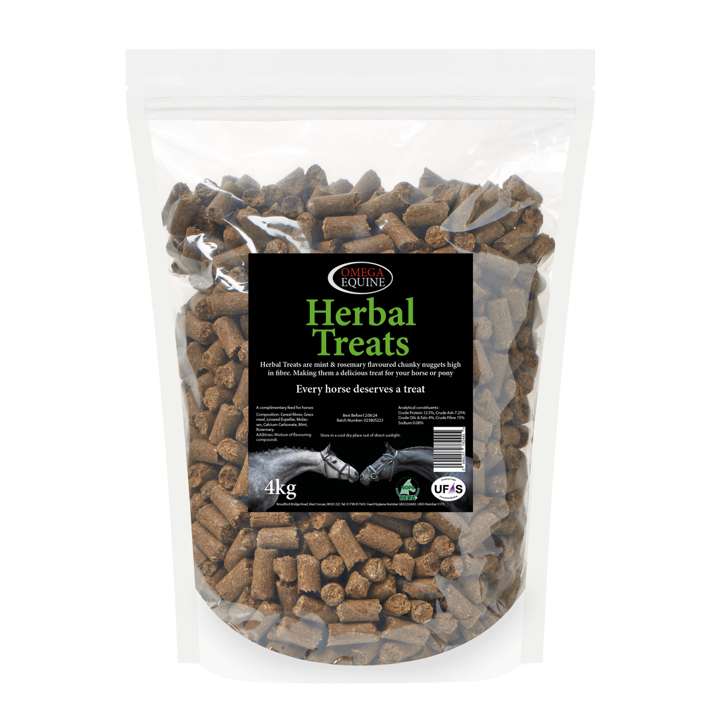 Omega Equine Treats are available in Herbal, Coconut and Toffee Apple flavour. They are packaged in a handy resealable bag for storage. A perfect size for training or to reward your horse.