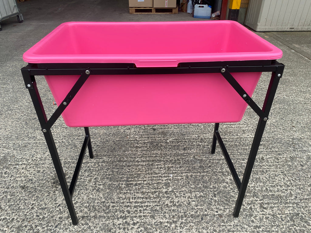 Our specialized stand for the Best4Trade 90-litre containers is designed for stable and efficient dog bathing, securely holding the container in place when filled with water. The sturdy, foldable stand features push lock bars on each leg to prevent collapse, ensuring stability during use, while adjustable leg components allow for a level bath surface on uneven ground. This practical design not only ensures a secure and mess-free bathing experience but also offers easy storage, making dog bathing a smoother and more enjoyable task.