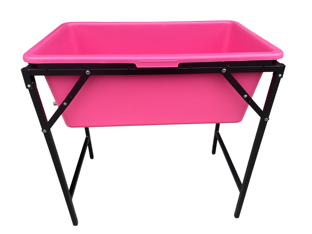 Our specialized stand for the Best4Trade 90-litre containers is designed for stable and efficient dog bathing, securely holding the container in place when filled with water. The sturdy, foldable stand features push lock bars on each leg to prevent collapse, ensuring stability during use, while adjustable leg components allow for a level bath surface on uneven ground. This practical design not only ensures a secure and mess-free bathing experience but also offers easy storage, making dog bathing a smoother and more enjoyable task.