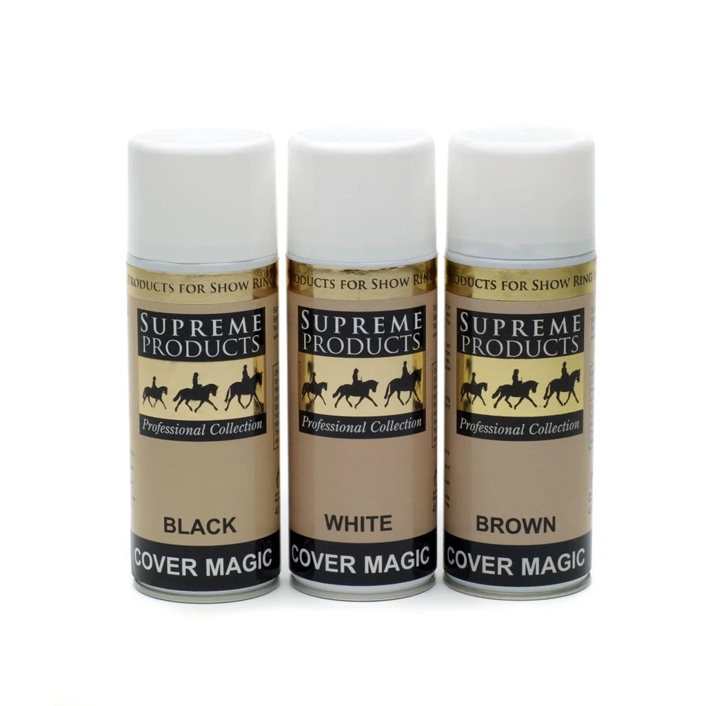 Supreme Products Cover Magic is a quick and effective spray-on solution designed to conceal stains, blemishes, and uneven patches in the coat—ideal for last-minute touch-ups before entering the show ring.