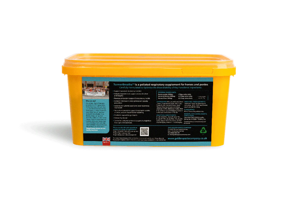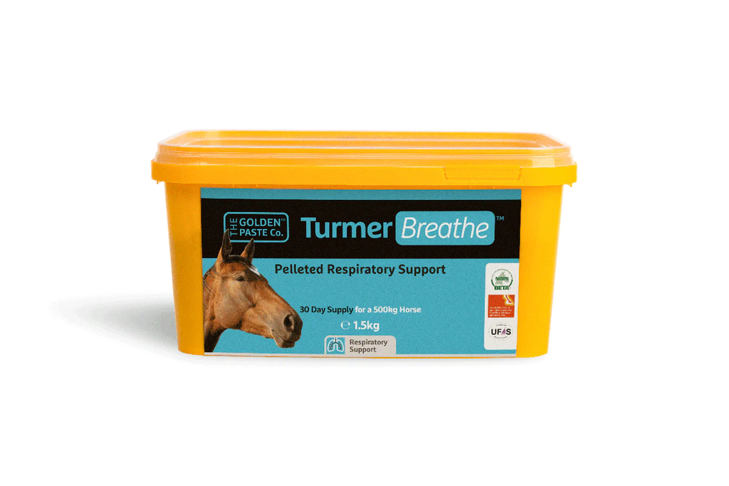 TurmerBreathe is a targeted respiratory and immune support supplement for horses and ponies, designed to help maintain clear airways, healthy breathing, and overall wellbeing. Ideal for horses prone to coughs, seasonal allergies, or dust sensitivity, it combines the natural power of turmeric with a blend of herbs, oils, and antioxidants to soothe, protect, and strengthen the respiratory system.