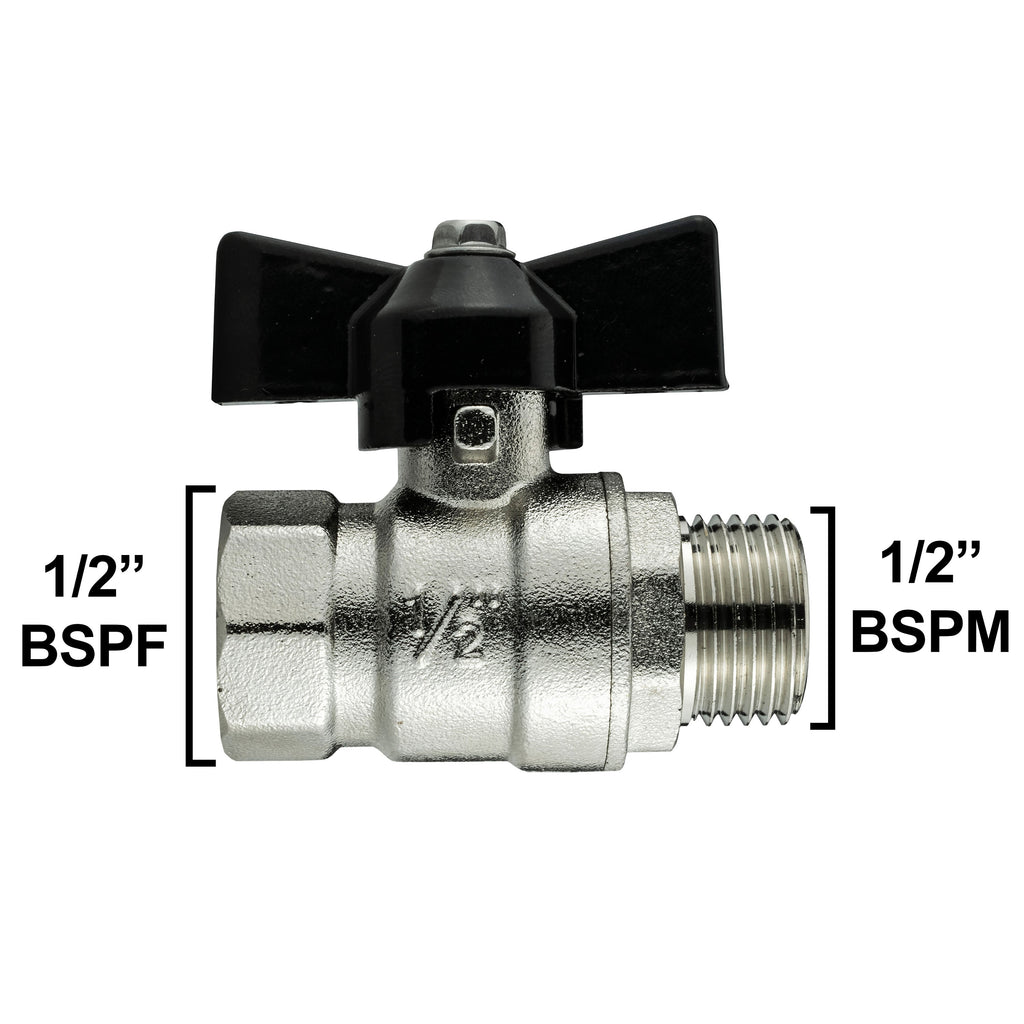 The Brass Nickel Plated Butterfly Valve 1/2" BSPM-F is a robust and reliable valve designed for various fluid control applications. This valve features BSP (British Standard Pipe) threads, making it compatible with a wide range of piping systems that adhere to these standards. The valve's body is constructed from high-quality brass, which is nickel-plated to enhance its durability, corrosion resistance, and overall lifespan, making it suitable for both indoor and outdoor installations.
